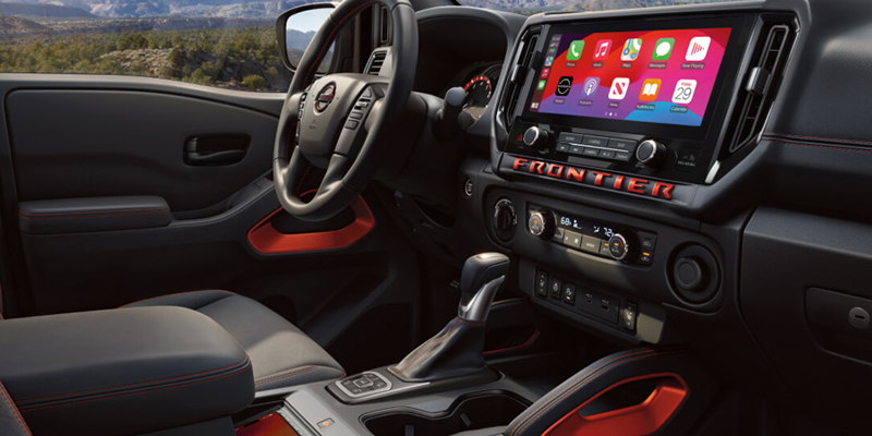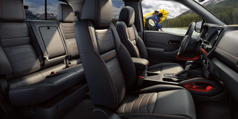 The interior of the 2026 Nissan Frontier is designed for both utility and comfort. The Crew Cab models offer versatile 60/40-split rear bench seating that can be flipped up to provide hidden under-seat storage, ideal for securing tools or other gear. The King Cab is perfect for those needing more cargo space, featuring rear-swinging doors for easy loading. Higher trims like the SV come with additional amenities such as heated front seats, a heated steering wheel, and dual-zone automatic climate control. The PRO-4X trim enhances the experience with a power sliding glass moonroof, offering a spacious and airy feel. The Frontier’s cabin is crafted to meet the needs of drivers who expect a combination of practicality and comfort.