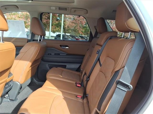 The 2025 Nissan Pathfinder comes equipped with the following 4WD, 13 Speakers, 3rd row seats: bench, 4-Wheel Disc Brakes, ABS brakes, Air Conditioning, Alloy wheels, AM/FM radio: SiriusXM, Auto High-beam Headlights, Auto tilt-away steering wheel, Auto-dimming Rear-View mirror, Automatic temperature control, Bodyside moldings, Bose Premium Audio System, Brake assist, Bumpers: body-color, Climate Controlled Front Bucket Seats, Delay-off headlights, Driver door bin, Driver vanity mirror, Dual front impact airbags, Dual front side impact airbags, Electronic Stability Control, Emergency communication system, Exterior Parking Camera Rear, Four wheel independent suspension, Front anti-roll bar, Front Bucket Seats, Front Center Armrest, Front dual zone A/C, Front reading lights, Fully automatic headlights, Garage door transmitter: HomeLink, Heads-Up Display, Heated door mirrors, Heated front seats, Heated rear seats, Heated steering wheel, Illuminated entry, Knee airbag, Leather steering wheel, Low tire pressure warning, Memory seat, Navigation system: NissanConnect with Navigation and Services, NissanConnect featuring Apple CarPlay and Android Auto, NissanConnect with Navigation and Services, Occupant sensing airbag, Outside temperature display, Overhead airbag, Overhead console, Panic alarm, Passenger door bin, Passenger vanity mirror, Power door mirrors, Power driver seat, Power Liftgate, Power moonroof, Power passenger seat, Power steering, Power windows, Premium Paint, Radio data system, Radio: AM/FM Audio System, Rain sensing wipers, Rear air conditioning, Rear anti-roll bar, Rear reading lights, Rear seat center armrest, Rear side impact airbag, Rear window defroster, Rear window wiper, Reclining 3rd row seat, Remote keyless entry, Security system, Semi-Aniline Leather-Appointed Seating Surfaces, Speed control, Speed-sensing steering, Speed-Sensitive Wipers, Split folding rear seat, Spoiler, Steering wheel memory, Steering wheel mounted audio controls, Tachometer, Telescoping steering wheel, Tilt steering wheel, Traction control, Trip computer, Turn signal indicator mirrors, Variably intermittent wipers, Ventilated front seats, and Wheels: 20" x 8J Machined Alloy. White Pearl 2025 Nissan Pathfinder Platinum 4WD 9-Speed Automatic 3.5L V6 DOHC 4WD.