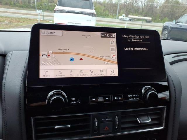 The 2021 Nissan Armada comes equipped with the following Captain's Chairs Package (2nd Row Captain's Chairs and 2nd Row Center Console w/Padded Armrest), Midnight Edition Package (20" Aluminum Alloy Wheels and Leather Appointed Seat Trim), 4WD, 13 Speakers, 2.94 Axle Ratio, 20" Painted Alloy Wheels, 3rd row seats: split-bench, 4-Wheel Disc Brakes, ABS brakes, Air Conditioning, Alloy wheels, AM/FM radio: SiriusXM, Anti-whiplash front head restraints, Auto High-beam Headlights, Auto tilt-away steering wheel, Auto-dimming door mirrors, Auto-dimming Rear-View mirror, Auto-leveling suspension, Automatic temperature control, Brake assist, Bumpers: body-color, Delay-off headlights, Driver door bin, Driver vanity mirror, Dual front impact airbags, Dual front side impact airbags, Electronic Stability Control, Emergency communication system: NissanConnect Services, Exterior Parking Camera Rear, Four wheel independent suspension, Front anti-roll bar, Front Bucket Seats, Front Center Armrest, Front dual zone A/C, Front fog lights, Front reading lights, Fully automatic headlights, Garage door transmitter: HomeLink, Heated door mirrors, Heated Front Bucket Seats, Heated front seats, Illuminated entry, Illuminated Kick Plates, Leather Seat Trim, Leather Shift Knob, Low tire pressure warning, Memory seat, Navigation System, NissanConnect featuring Apple CarPlay and Android Auto, Occupant sensing airbag, Outside temperature display, Overhead airbag, Overhead console, Panic alarm, Passenger door bin, Passenger vanity mirror, Power door mirrors, Power driver seat, Power Liftgate, Power moonroof, Power passenger seat, Power steering, Power windows, Radio: NissanConnect w/SiriusXM, Rear air conditioning, Rear anti-roll bar, Rear reading lights, Rear seat center armrest, Rear window defroster, Rear window wiper, Reclining 3rd row seat, Remote keyless entry, Security system, Special Paint - Aspen White, Speed control, Speed-sensing steering, Speed-Sensitive Wipers, Split folding rear seat, Spoiler, Steering wheel memory, Steering wheel mounted audio controls, Tachometer, Telescoping steering wheel, Tilt steering wheel, Traction control, Trip computer, Turn signal indicator mirrors, Variably intermittent wipers, and Voltmeter. 2021 Nissan Armada