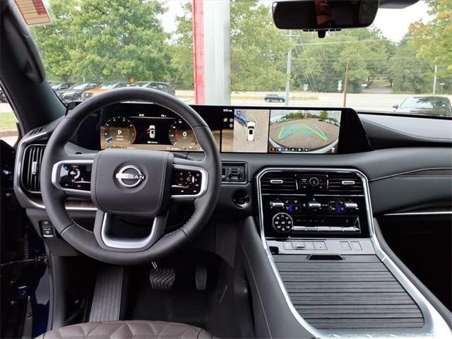 The 2025 Nissan Armada comes equipped with the following Split Bench Seat Package (2nd-Row Split Bench Seat w/40/20/40-Split Folding, Center Armrest w/2 Cupholders, and EZ Flex 2nd-Row Seating System w/1-Touch Release), 4WD, 12 Speakers, 3rd row seats: split-bench, 4-Wheel Disc Brakes, ABS brakes, Adaptive suspension, Air Conditioning, Alloy wheels, AM/FM radio: SiriusXM, Anti-whiplash front head restraints, Auto High-beam Headlights, Auto tilt-away steering wheel, Auto-dimming door mirrors, Auto-dimming Rear-View mirror, Auto-leveling suspension, Automatic temperature control, Brake assist, Bumpers: body-color, Carpeted Floor Mats - Bench Seat, Center Front Spoiler, Climate Controlled Heated & Ventilated Front Seats, Delay-off headlights, Driver door bin, Driver vanity mirror, Dual front impact airbags, Dual front side impact airbags, Electronic Stability Control, Emergency communication system: NissanConnect Services, Four wheel independent suspension, Front anti-roll bar, Front Bucket Seats, Front Center Armrest, Front dual zone A/C, Front fog lights, Front reading lights, Fully automatic headlights, Garage door transmitter: myQ Connected Garage, Genuine wood dashboard insert, Heads-Up Display, Heated door mirrors, Heated front seats, Heated rear seats, Heated steering wheel, HVAC memory, Illuminated entry, Illuminated Kick Plates, Knee airbag, Leather steering wheel, Low tire pressure warning, Memory seat, Navigation System, Occupant sensing airbag, Outside temperature display, Overhead airbag, Overhead console, Panic alarm, Passenger door bin, Passenger vanity mirror, Power door mirrors, Power driver seat, Power Liftgate, Power moonroof, Power passenger seat, Power steering, Power windows, Quilted Leather Seat Trim, Radio: NissanConnect w/SiriusXM 360L, Rain sensing wipers, Rear air conditioning, Rear anti-roll bar, Rear Bumper Protector, Rear reading lights, Rear window defroster, Rear window wiper, Reclining 3rd row seat, Remote keyless entry, Roof Rail Cross Bars, Security system, Speed control, Speed-sensing steering, Speed-Sensitive Wipers, Splash Guards, Split folding rear seat, Spoiler, Steering wheel memory, Steering wheel mounted audio controls, Tachometer, Telescoping steering wheel, Tilt steering wheel, Traction control, Trip computer, Turn signal indicator mirrors, Variably intermittent wipers, Ventilated front seats, Voltmeter, and Wheels: 22" Painted Alloy. 2025 Nissan Armada