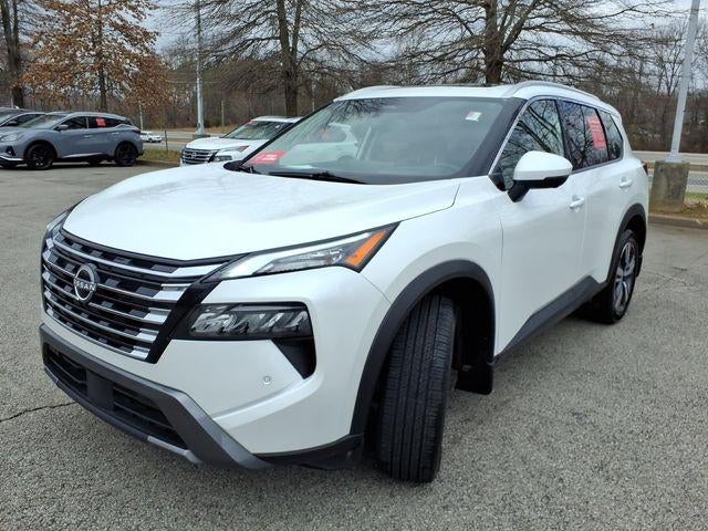 The 2025 Nissan Rogue comes equipped with the following SL Premium Package (Head-Up Display, Memory Driver Seat and Outside Mirrors, Motion-Activated Power Liftgate, Panoramic Moonroof, Rear Door Sunshades, Rear Personal Lights, Reverse Tilt-Down Outside Mirrors, and Tri-Zone Automatic Temperature Control), Certified Select Certified, Navigation system: NissanConnect with Navigation and Services, 4-Wheel Disc Brakes, 6 Speakers, ABS brakes, Air Conditioning, Alloy wheels, AM/FM radio: SiriusXM with 360L, Android Auto and Apple CarPlay, Auto High-beam Headlights, Auto-dimming Rear-View mirror, Automatic temperature control, Brake assist, Bumpers: body-color, Chrome Rear Bumper Protector, Delay-off headlights, Driver door bin, Driver vanity mirror, Dual front impact airbags, Dual front side impact airbags, Electronic Stability Control, Emergency communication system: NissanConnect Services, First Aid Kit, Floor Mats with 2-Piece Cargo Area Protector, Four wheel independent suspension, Front anti-roll bar, Front Bucket Seats, Front Center Armrest, Front dual zone A/C, Front reading lights, Fully automatic headlights, Garage door transmitter: myQ Connected Garage, Heated door mirrors, Heated Front Bucket Seats with 8-Way Power Driver Seat and 4-Way Power Passenger Seat, Heated steering wheel, Illuminated entry, Knee airbag, Leather-Appointed Seat Trim, Low tire pressure warning, Occupant sensing airbag, Outside temperature display, Overhead airbag, Overhead console, Panic alarm, Passenger door bin, Passenger vanity mirror, Power door mirrors, Power driver seat, Power Liftgate, Power passenger seat, Power steering, Power windows, Premium Paint, Radio data system, Radio: NissanConnect with Navigation and 6 Speakers, Rear anti-roll bar, Rear seat center armrest, Rear side impact airbag, Rear window defroster, Rear window wiper, Remote keyless entry, Security system, Speed control, Speed-sensing steering, Speed-Sensitive Wipers, Split folding rear seat, Spoiler, Steering wheel mounted audio controls, Tachometer, Telescoping steering wheel, Tilt steering wheel, Traction control, Trip computer, Turn signal indicator mirrors, Variably intermittent wipers, and Wheels: 19" Dark Painted Machine Finished Alloy. 2025 Nissan Rogue